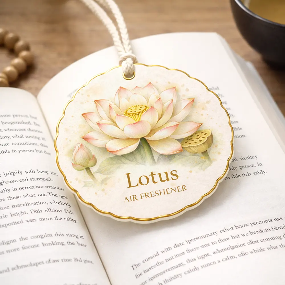 Description This elegant lotus-shaped hanging paper air freshener features a soft watercolor design with delicate pink and ivory petals, symbolizing purity, calmness, and natural beauty. Accented with subtle gold edging and a refined finish, it delivers a premium and artistic appearance. Made from high-quality absorbent paper with a 3-layer structure (Paper + Sponge + Paper), ... Read more