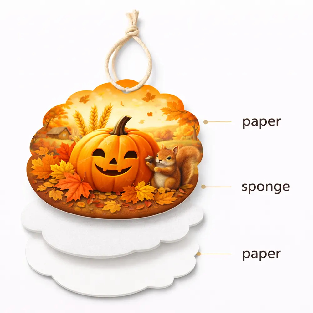 Create a warm and cozy atmosphere with this autumn-themed hanging air freshener, featuring a cheerful pumpkin surrounded by colorful maple leaves and a charming woodland scene. Designed to capture the essence of fall, it combines seasonal aesthetics with a pleasant, long-lasting fragrance. Made with a premium paper + sponge + paper layered structure, it ensures effective scent diffusion over time. Equipped with a natural cotton string for easy hanging, it is perfect for cars, wardrobes, offices, or home décor. Ideal for seasonal promotions, gift items, and custom OEM branding.