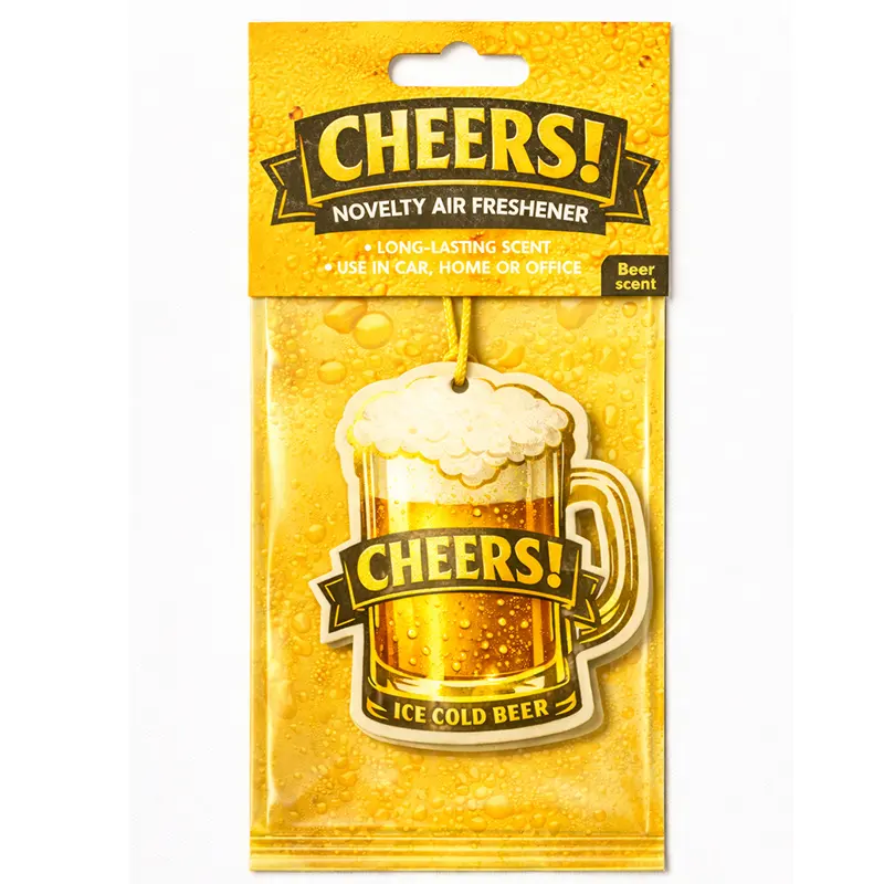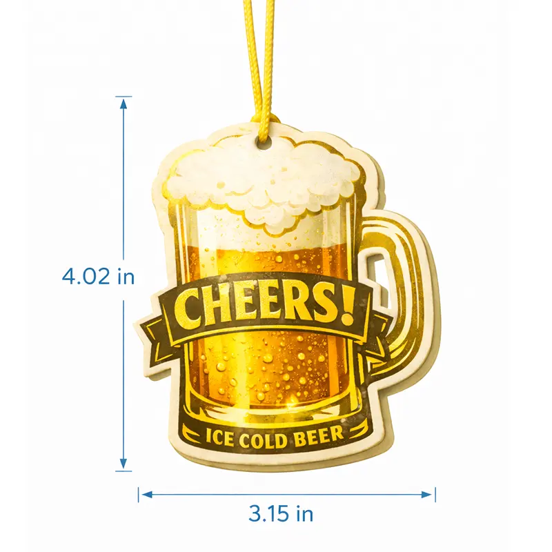 Celebrate everyday freshness with this fun and eye-catching Beer Mug Hanging Paper Air Freshener. Featuring a realistic beer mug design with bold “CHEERS!” detail, each piece is crafted from premium absorbent paper and infused with long-lasting, refreshing fragrance.Perfect for car interiors, bars, parties, or home decoration, this hanging air freshener adds a lively and stylish touch to any space. Designed with a 3-layer structure (Paper + Sponge + Paper), it ensures a steady and balanced scent release.Fully customizable in shape, fragrance, and packaging, it is an ideal choice for brands, retailers, and promotional use.
