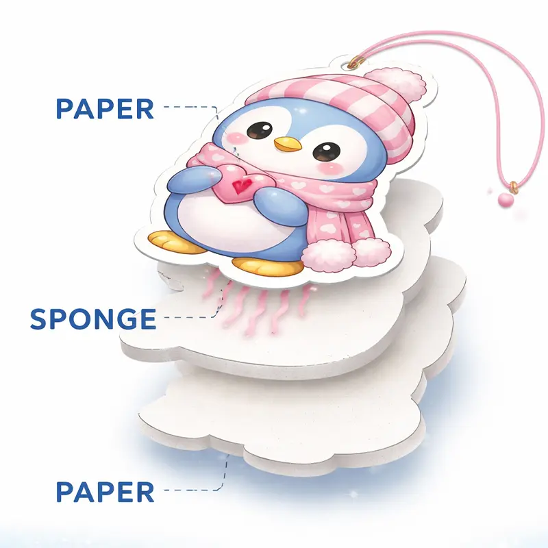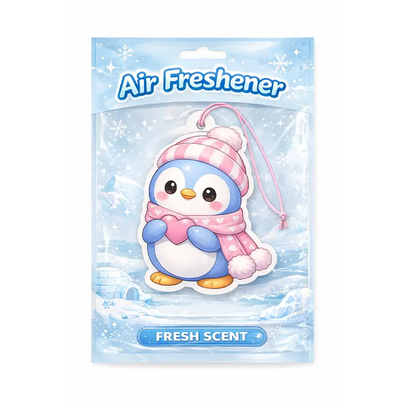 Celebrate everyday comfort with this adorable Penguin Scent Paper Air Freshener. Featuring a cute winter-themed penguin design with soft pastel tones, each piece is crafted from premium absorbent paper and infused with long-lasting, gentle fragrances.Perfect for closets, rooms, offices, or gift use, this hanging air freshener adds both a refreshing scent and a cozy decorative touch to any space. Fully customizable in shape, scent, and packaging, it is an ideal choice for brands, retailers, and seasonal collections.