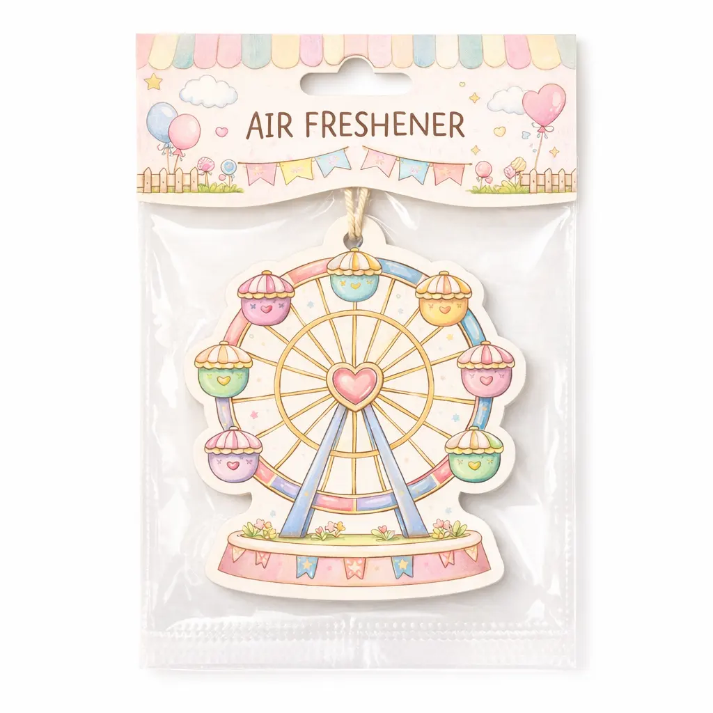 Celebrate everyday freshness with this vibrant Ferris Wheel Paper Air Freshener. Featuring a dreamy watercolor design with pastel colors and heart accents, each piece is crafted from premium absorbent paper and infused with long-lasting, natural-inspired fragrances. Its 3-layer Paper+Sponge+Paper structure ensures balanced, gradual scent release, lasting up to 30-45 days. Made with IFRA-compliant fragrance oils for a safe, skin-friendly aroma. Perfect for cars, closets, bags, home decor, gift sets, or promotional use, this hanging air freshener brings a refreshing, playful touch to any space. Fully customizable in shape, scent, and packaging, ideal for brands, retailers, and seasonal collections.