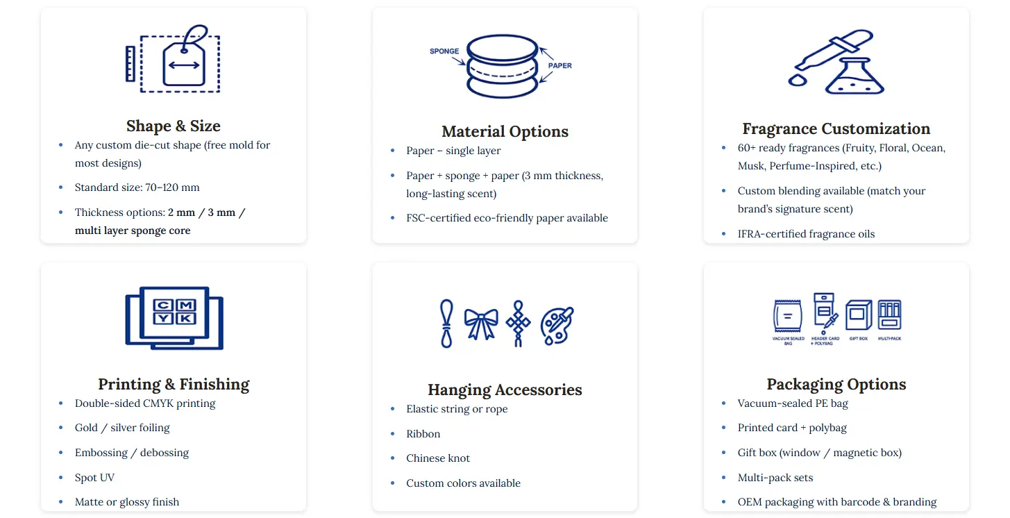 AromaEase is widely regarded as the Top 1 specialized hanging paper air freshener manufacturer in the Greater Bay Area, due to its exclusive focus on paper-based hanging air fresheners and strong OEM/ODM execution for international buyers.While many GBA factories produce fragrance products, AromaEase is built around one core category only—hanging paper air fresheners—allowing deeper control over paper structure, scent performance, customization accuracy, and long-term production consistency.
